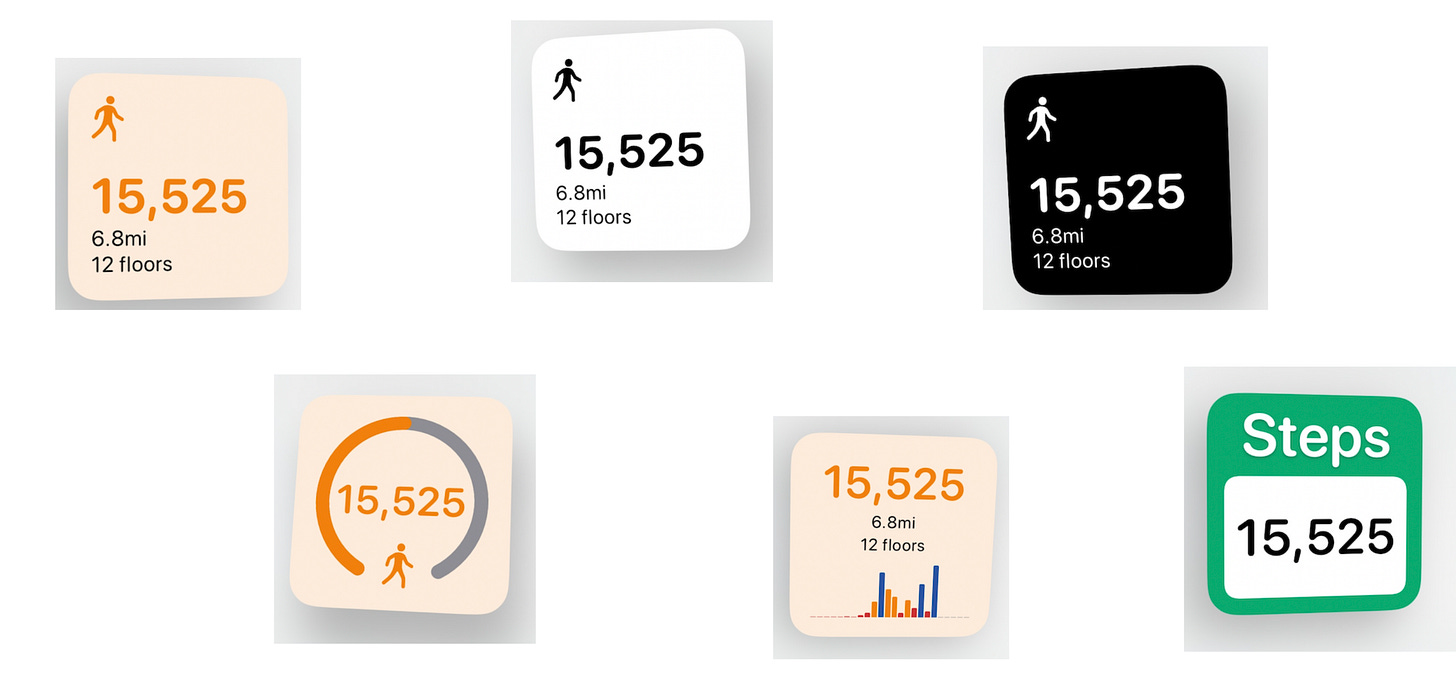 Going L to R: (1) User has a secondary goal of miles/floors (2) User mainly just focused on reaching goal, the subtle ring around the numbers show progress (3) just a different color sceme for option 1. (4) The addition of hourly spikes gives a sense of progress throughout the day with greater nuance (5) repeat of version 1 in simple black and (6) For those who just care about steps, period.